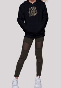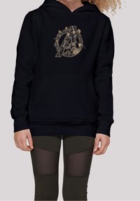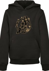 Haut à capuche noir avec un logo Avengers doré, associé à des leggings vert olive avec des panneaux transparents. Le modèle porte des chaussures de sport blanches.