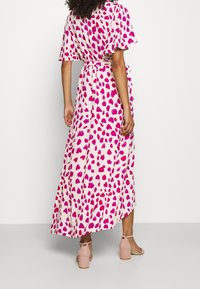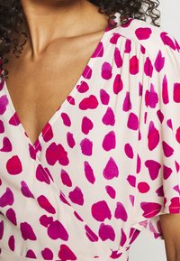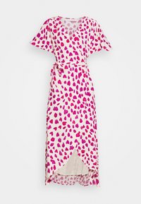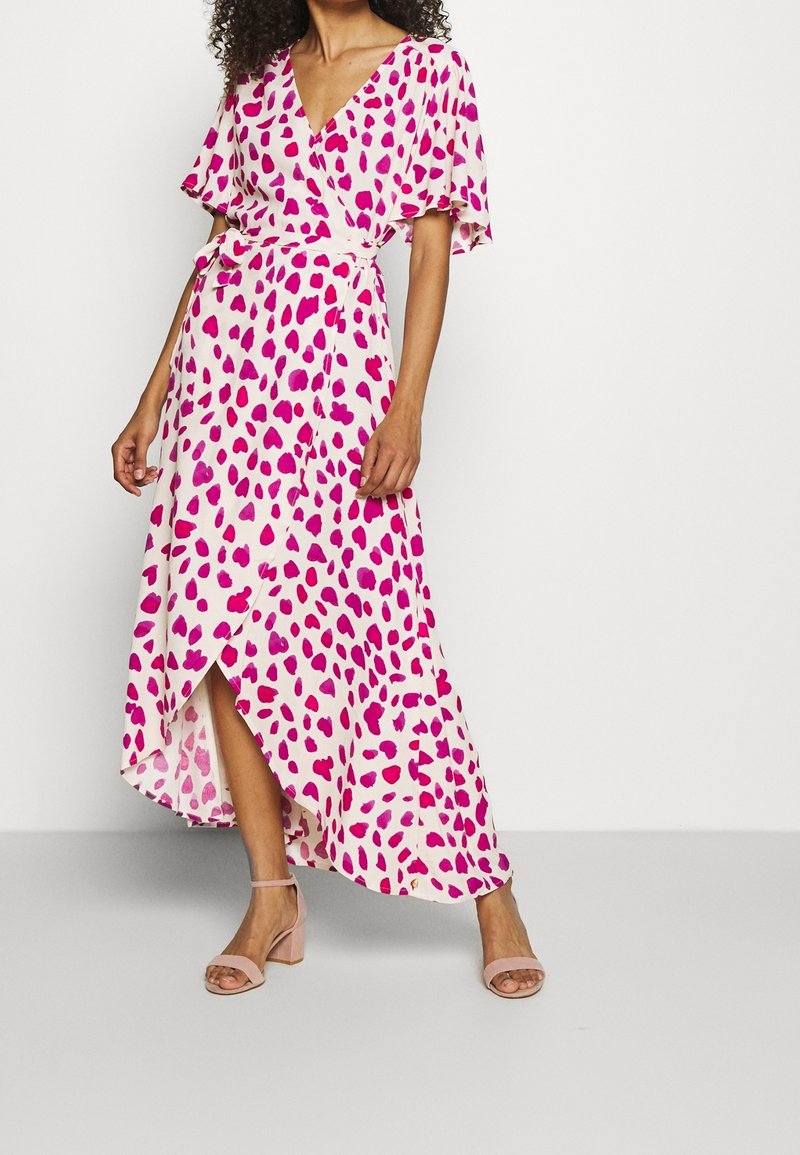 Femme portant une robe enveloppante blanche avec des taches irrégulières roses, des manches flottantes, une taille nouée et des sandales à talons blocs roses, se tenant sur un fond uni.