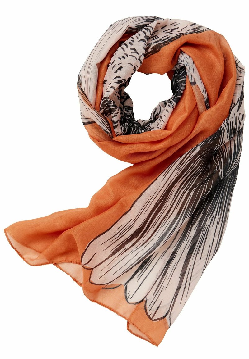 Écharpe légère avec des motifs de plumes d'oiseaux orange, beige et noir, roulée de manière lâche avec des bords de tissu fluides.