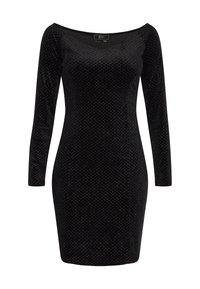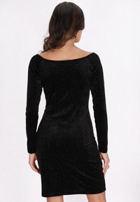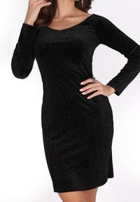 Robe en velours noir avec manches longues, encolure en V, silhouette ajustée et motif en diamants argentés sur toute la surface. Texture lisse, longueur au genou.
