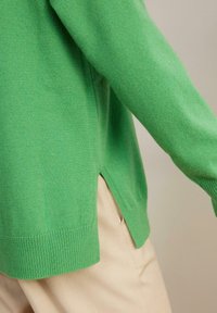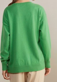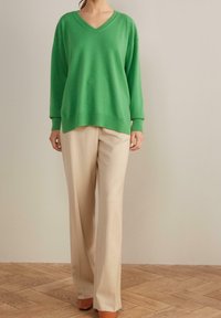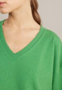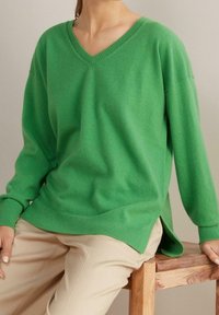 Pull vert à col en V en tissu tricoté doux. Comprend des manches longues et des poignets et ourlet côtelés. Coupe décontractée avec des détails de design minimalistes.