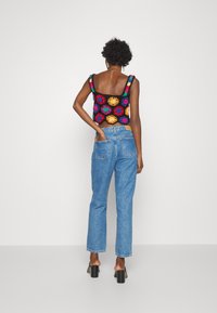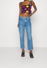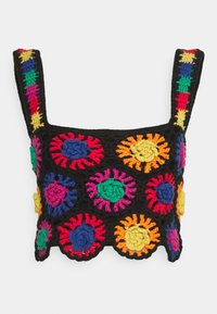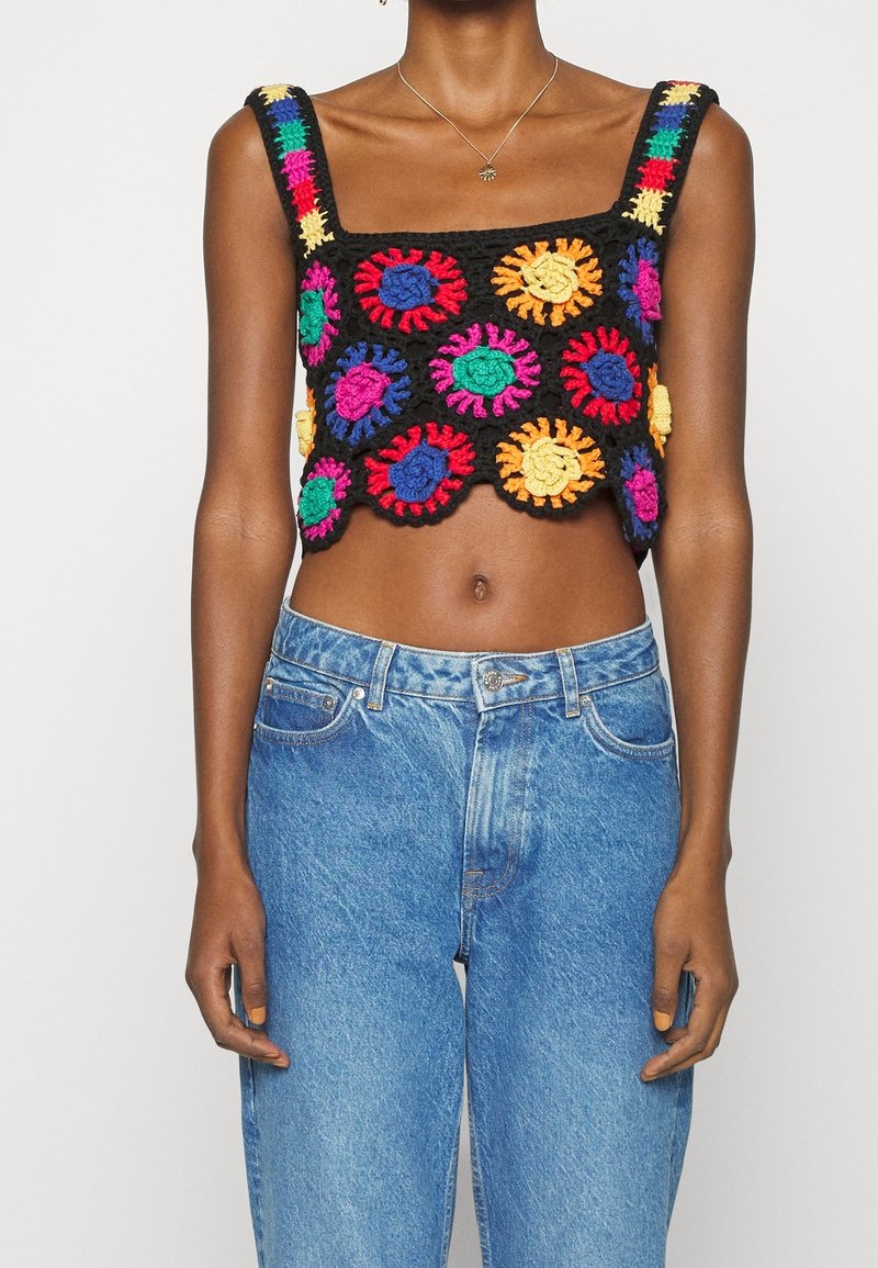 Haut court en crochet avec une base noire ornée de motifs floraux colorés en rouge, bleu, vert, orange et jaune. Encolure carrée et larges bretelles.