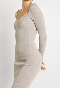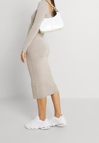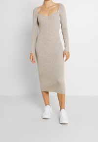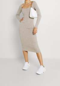 Robe midi ajustée à manches longues en tricot beige clair avec un décolleté carré et une texture côtelée, associée à des baskets de sport blanches.