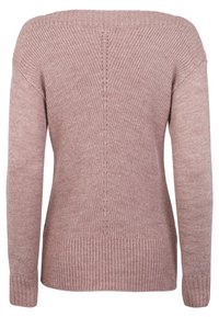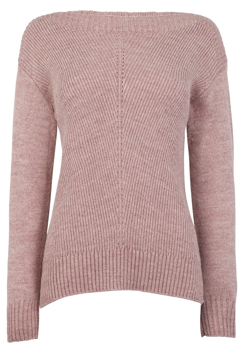 Pull en maille côtelée mauve clair avec manches longues et encolure bateau, présentant un motif vertical central ainsi que des poignets et un ourlet ajustés.