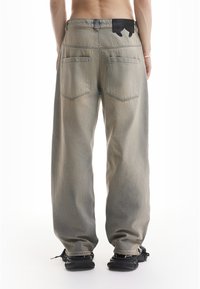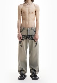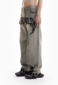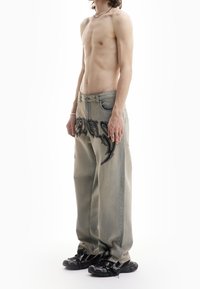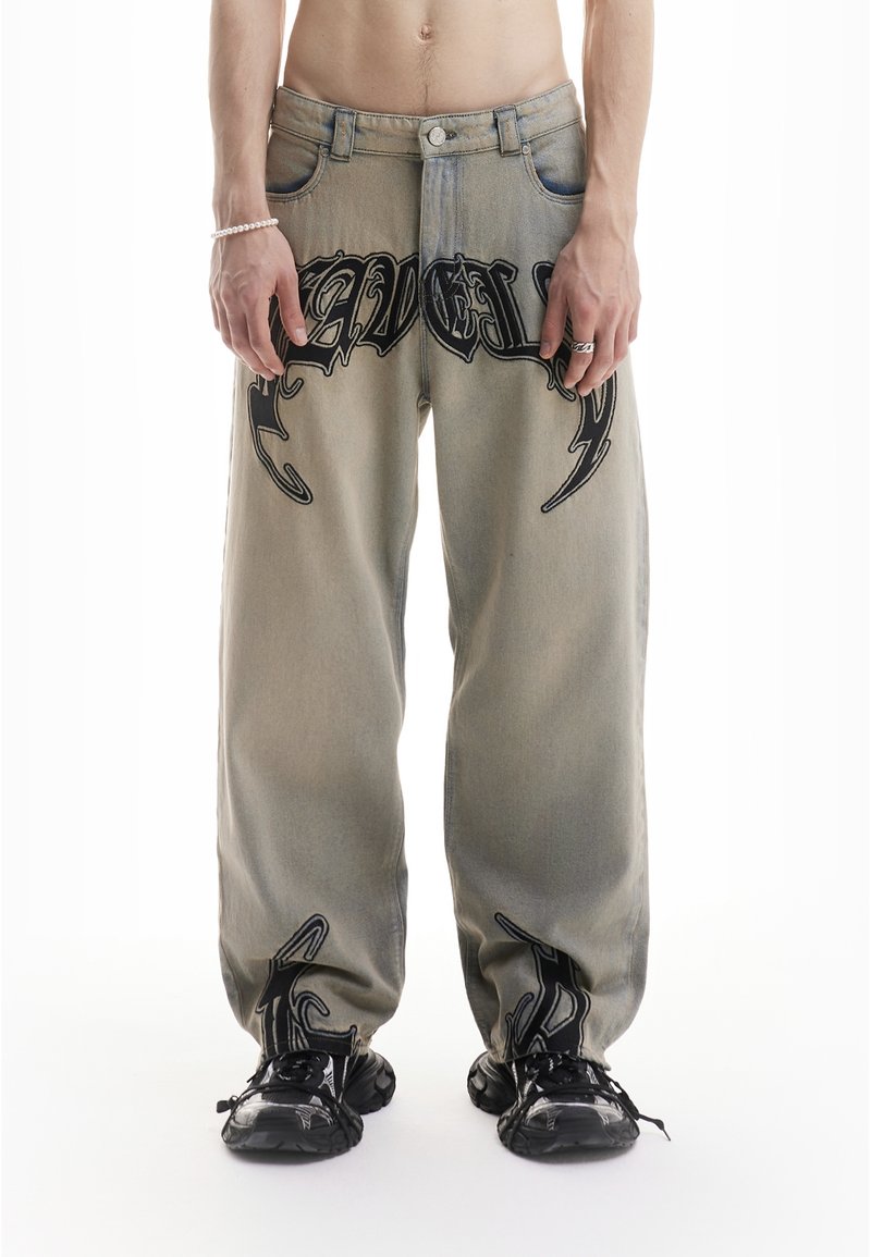 Homme portant un jean large délavé avec des lettres noires de style graffiti et des baskets noires, debout devant un fond blanc.