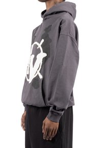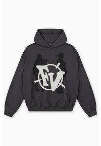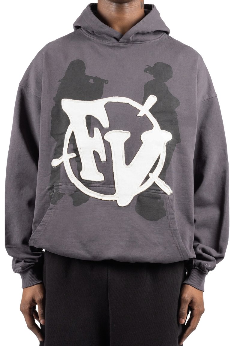Hoodie gris foncé avec un grand logo blanc "FV" et des silhouettes noires de deux personnes sur le devant, porté par une personne debout.