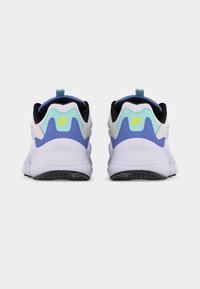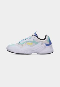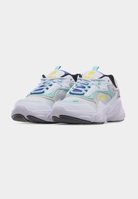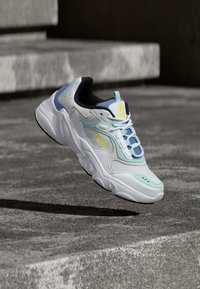 Baskets FILA blanches, bleues et vert menthe avec logo jaune, suspendues au-dessus de marches en béton projetant une ombre en dessous.