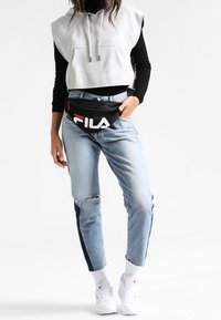 Personne ajustant un sac bandoulière noir FILA porté par-dessus un sweat à capuche turquoise et un jean bleu clair sur un fond uni.
