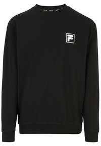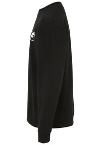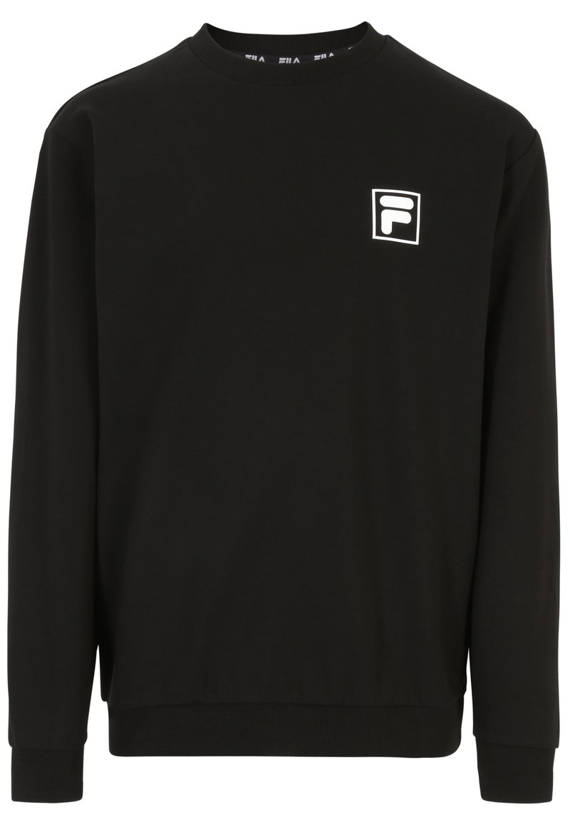 Sweat-shirt noir en coton avec manches longues, col ras du cou, poignets côtelés et un logo blanc sur la poitrine encadré d'un carré.