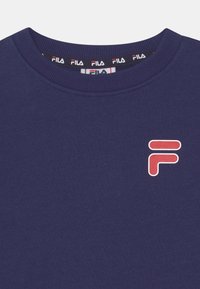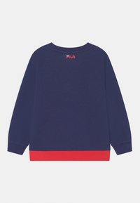 Sweat-shirt à manches longues bleu marine et rouge avec col rond, logo Fila sur le haut gauche de la poitrine, et poignets et ourlet côtelés.