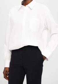 Chemise blanche à manches longues avec boutons et une poche sur la poitrine gauche, portée sur un pantalon noir, montrée du cou jusqu'aux hanches.