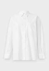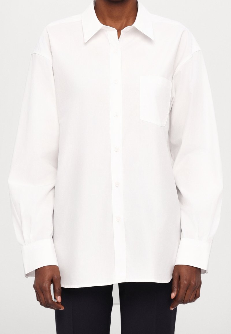 Chemise blanche à manches longues et à boutons avec deux poches poitrine, fabriquée en tissu léger. Elle présente un col et un ourlet arrondi.