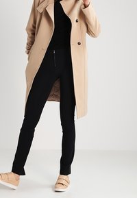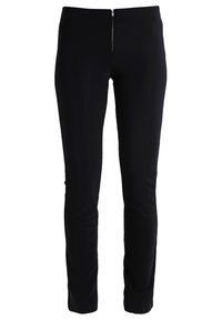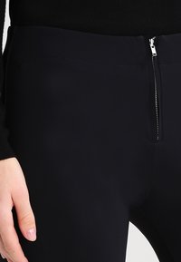 Leggings noirs moulants en matériau extensible, dotés d'une poche zippée à l'avant et d'une texture lisse et élégante.