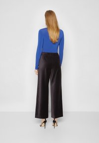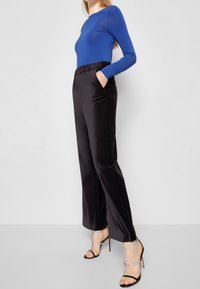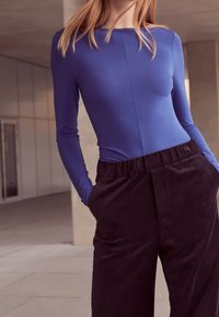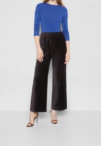 Pantalons larges en velours noir avec un waistband élastique, dotés de poches latérales. Associés à des talons noirs à lanières et un haut bleu à manches longues.