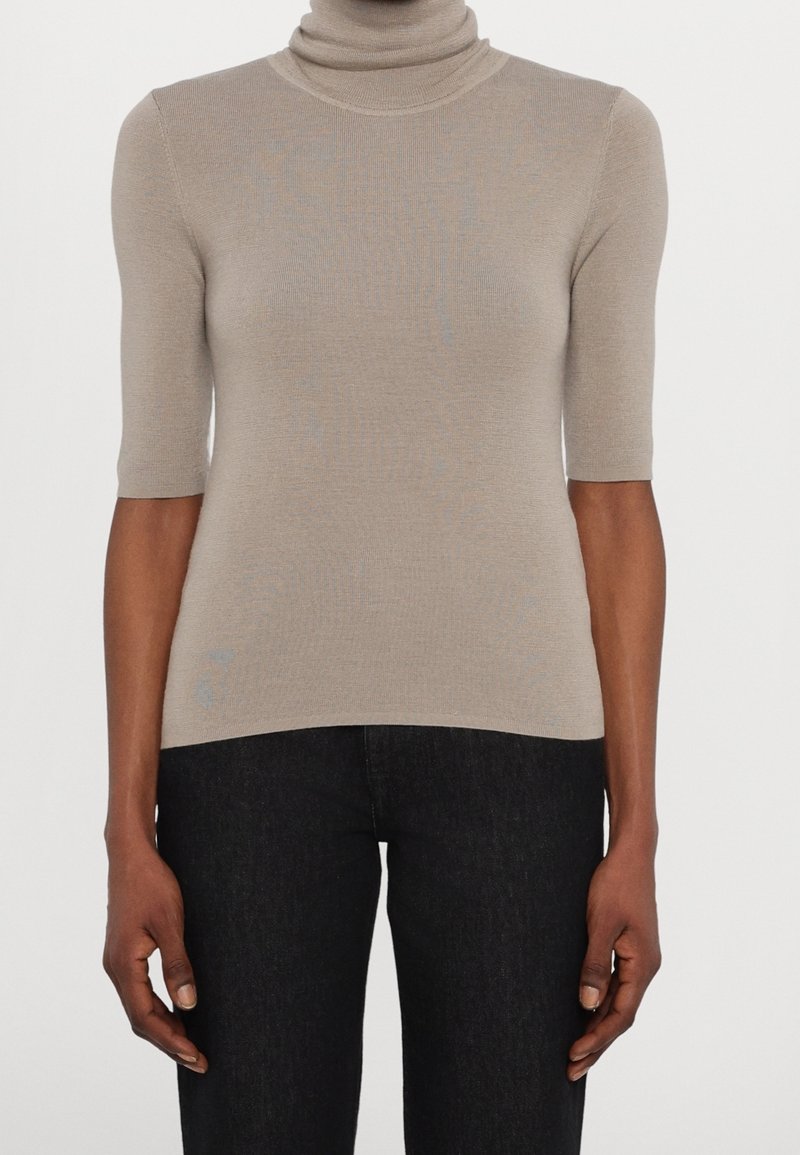 Personne portant un pull à col roulé beige à manches courtes associé à un pantalon noir taille haute, debout devant un fond neutre.