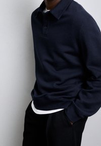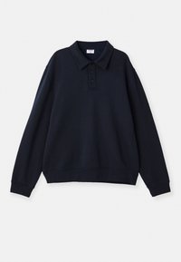 Pull-over bleu marine avec col et patte de boutonnage à trois boutons. Tissu doux et texturé, poignets et ourlet côtelés. Coupe ample, design minimaliste.