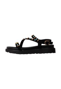Sandale plate marron avec semelle épaisse, boucle chevillère et clous turquoise et dorés sur les lanières.