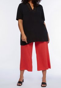Femme portant un haut noir à manches courtes avec un détail en dentelle en forme de V au col et un pantalon rouge vif, une main dans la poche et l'autre le long du corps.
