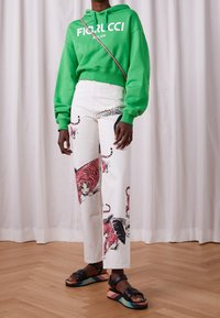 Personne portant un sweat à capuche vert Fiorucci, un pantalon blanc à imprimés tigres roses, des sandales noires avec semelles compensées multicolores, debout sur un sol en bois.