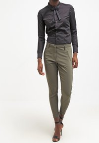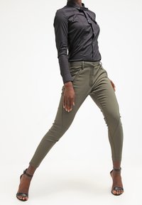 Pantalons ajustés olive avec une texture lisse, dotés de deux poches avant inclinées et de jambes fuselées, associés à une chemise noire à boutons.