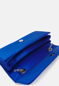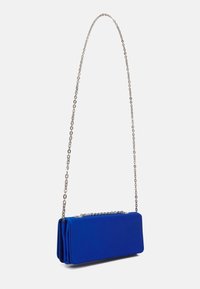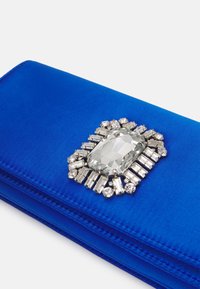 Pochette en satin bleu de forme rectangulaire, avec une bandoulière en chaîne argentée et une décoration ornée de pierres précieuses sur le devant, comprenant une grosse pierre centrale.