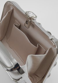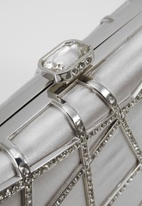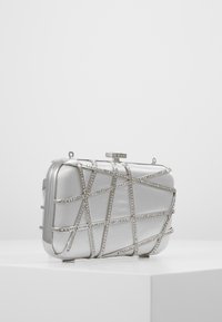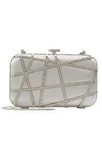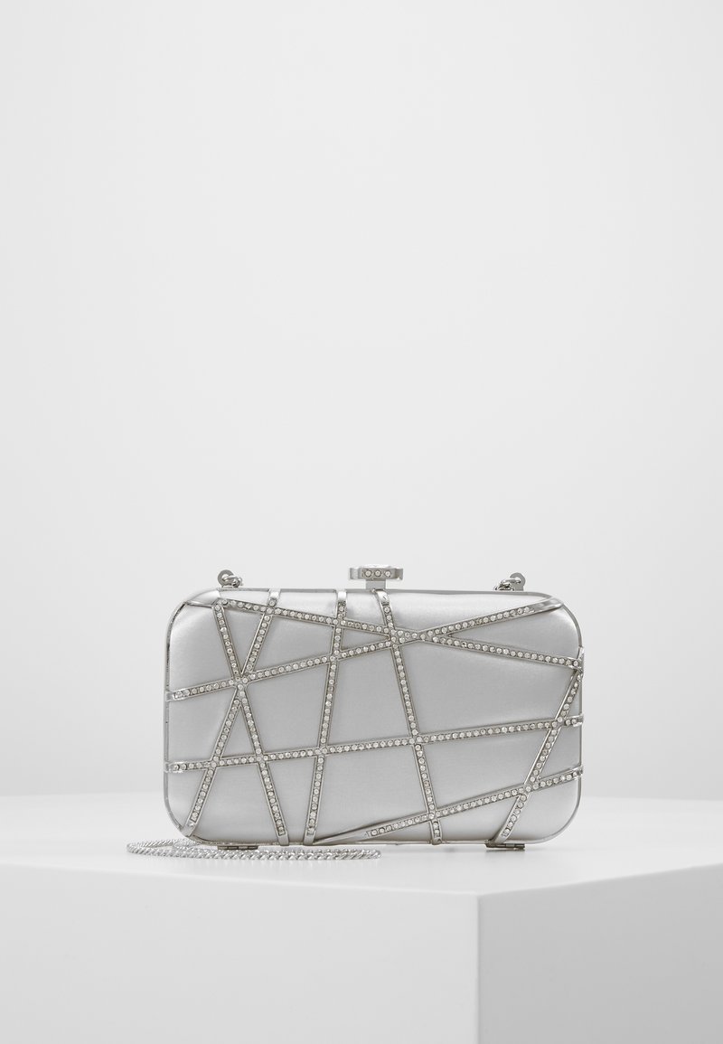 Pochette rectangulaire argentée avec motifs géométriques en strass et chaîne, posée sur un socle blanc sur un fond uni.