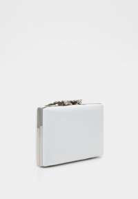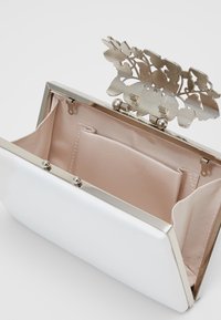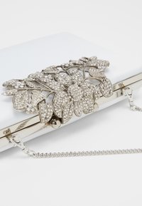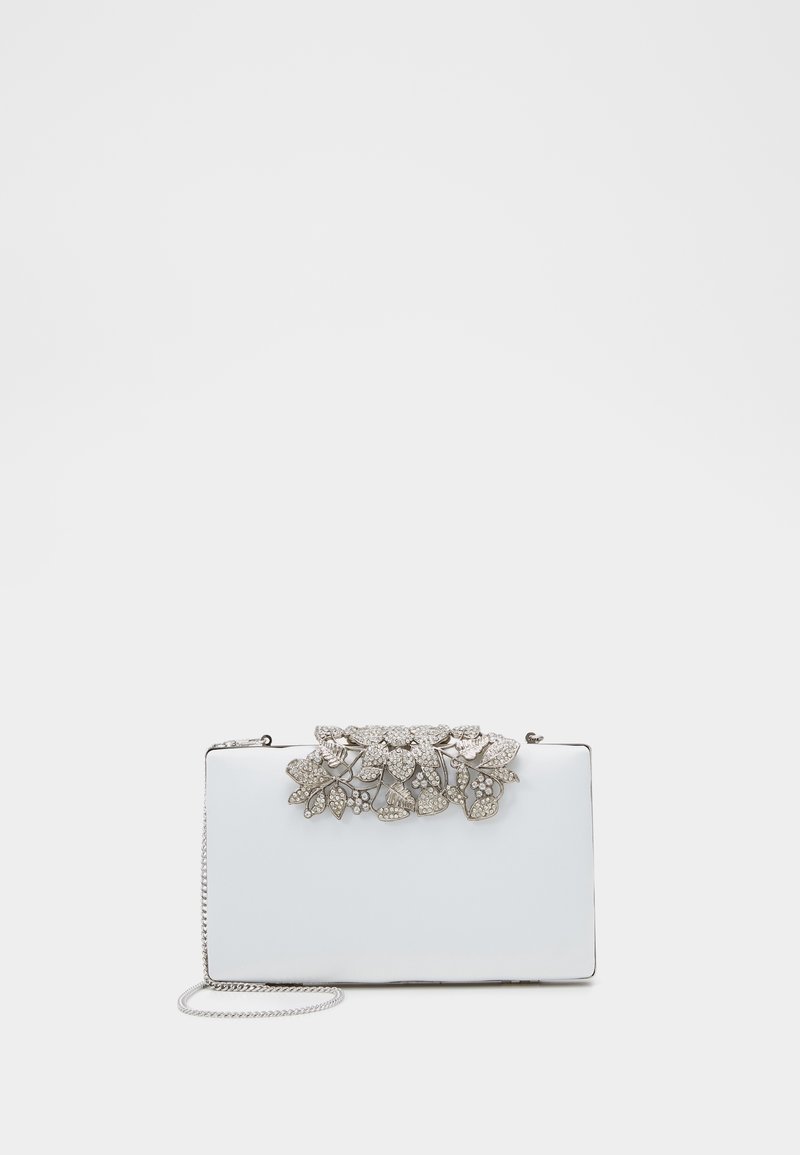 Pochette rectangulaire blanche avec fermoir floral en bijoux argentés et une fine chaîne argentée, sur un fond uni.