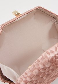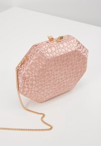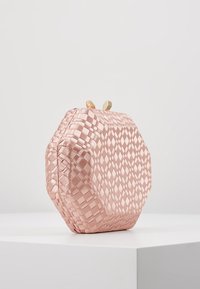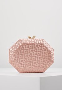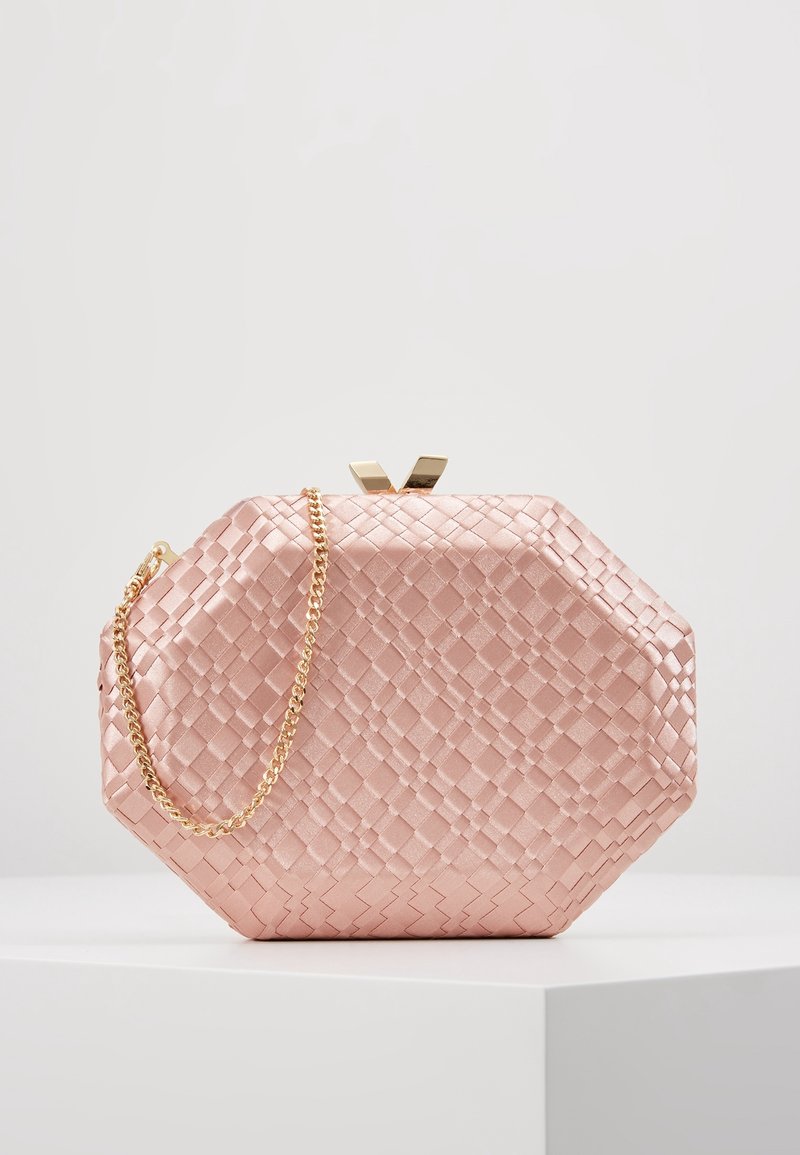 Pochette octogonale en satin rose avec motif tissé et chaîne dorée, présentée sur une surface blanche.