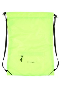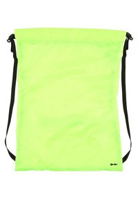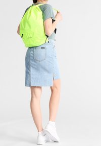 Personne marchant à l'écart portant une chemise à manches longues gris clair, un jean bleu clair, des baskets beiges et un sac à dos à cordon vert néon.