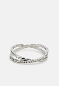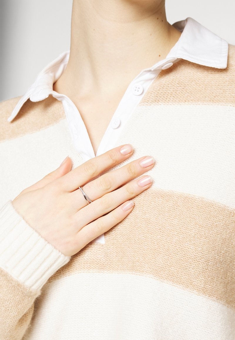 Personne à la peau claire portant un pull rayé beige et blanc touche sa poitrine avec la main gauche, montrant une bague en argent au doigt annulaire.