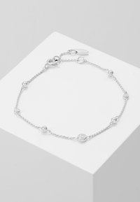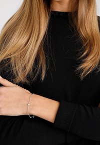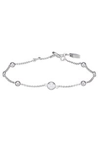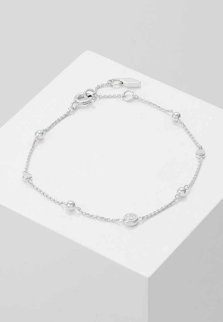 Bracelet délicat en chaîne d'argent avec de petites perles en argent espacées uniformément et des cristaux ronds étincelants sertis en chaton sur un bloc d'exposition blanc.