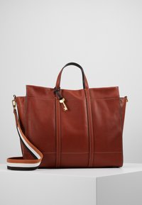 Sac fourre-tout en cuir marron avec deux poignées, bandoulière rayée amovible, et un petit porte-clés doré suspendu à une des poignées.