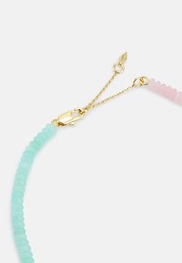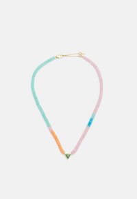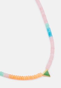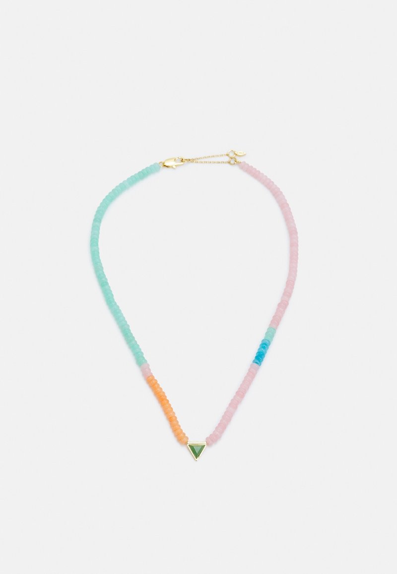 Collier de perles avec des perles alternées bleu pastel, rose et orange, un petit pendentif triangulaire vert et un fermoir en or.
