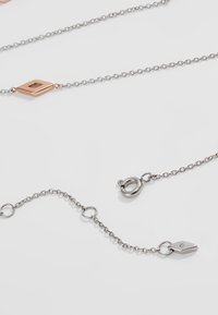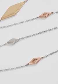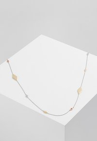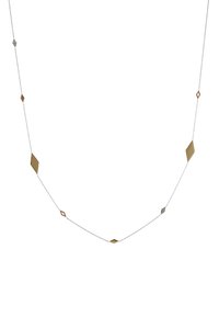 Collier délicat en chaîne d'argent avec des petites pièces métalliques en forme de diamant alternant en or, or rose et tons argentés, présenté sur une surface blanche.