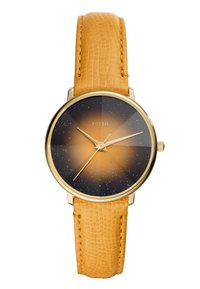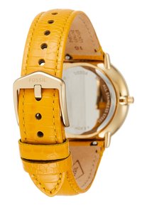 Personne à la peau foncée portant un pull en maille crème avec une montre à bracelet jaune affichant un cadran rond dégradé de marron à son poignet.