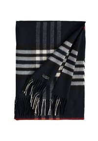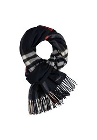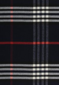 Écharpe à carreaux noire, blanche et rouge avec des franges aux extrémités, pliée en boucle, avec une petite étiquette de marque en tissu.