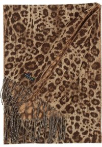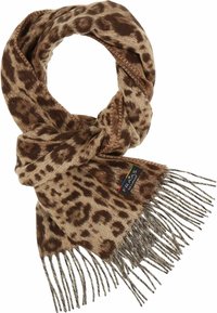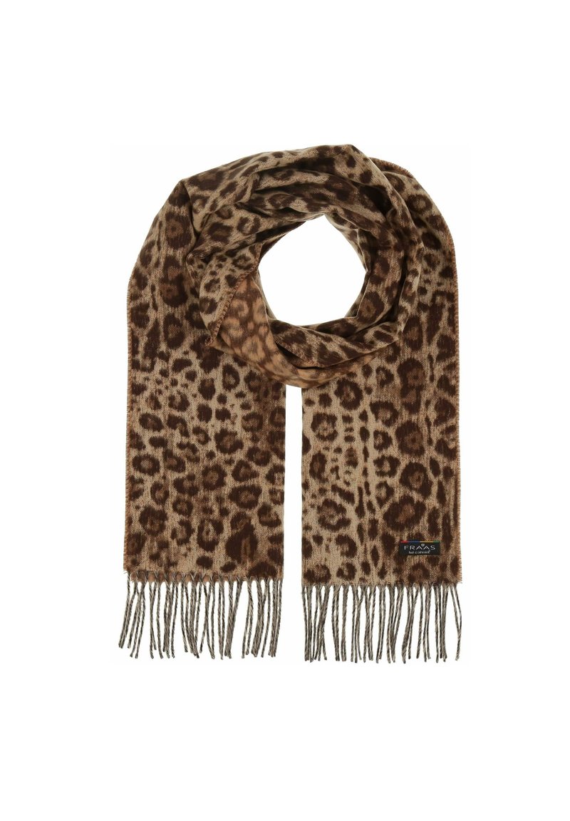 Écharpe à imprimé léopard marron avec des extrémités à franges, pliée en boucle, comportant une petite étiquette noire sur un côté.