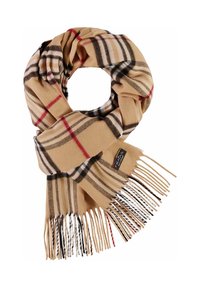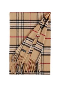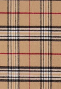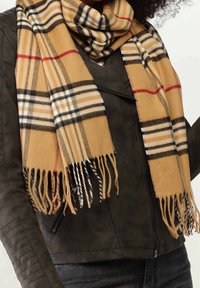 Personne portant une écharpe à carreaux beige avec des rayures noires, blanches et rouges sur une veste en cuir noire, mettant en avant les extrémités frangées de l'écharpe.