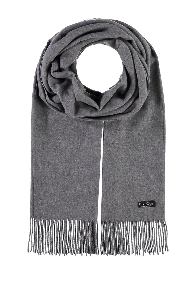 Écharpe en laine grise avec des extrémités à franges et une petite étiquette de marque noire sur un côté, sur fond blanc.