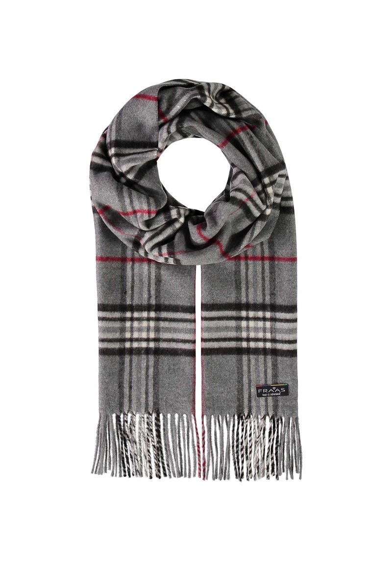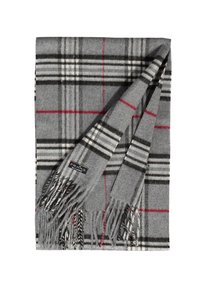 Écharpe à carreaux grise avec des rayures noires, blanches et rouges, finie avec des extrémités frangées et une petite étiquette de marque près du bord inférieur.