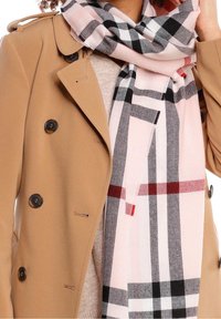 Femme portant un manteau beige et une écharpe à carreaux rose clair avec des rayures noires, grises et rouges, associée à un pull en maille beige.