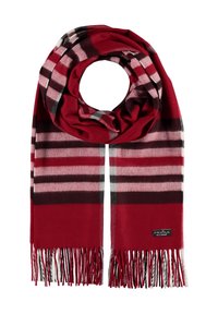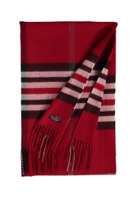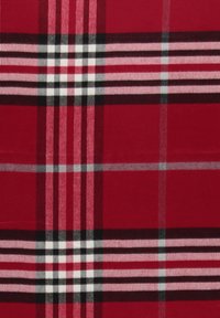 Écharpe à carreaux rouge, noire et blanche avec franges, enroulée autour du cou sur une veste gris foncé avec fermeture éclair et détails de boutons.