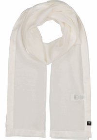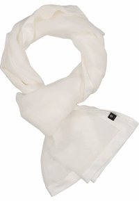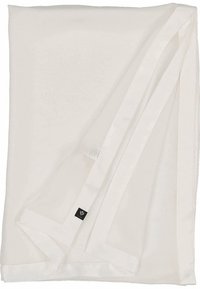 Écharpe rectangulaire blanche avec un léger éclat, pliée en boucle, présentant une petite étiquette de marque noire et une étiquette d'entretien.