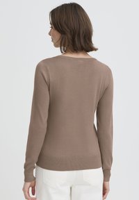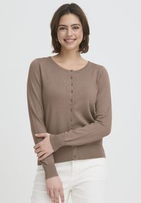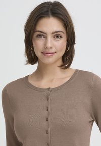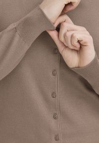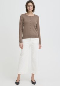 Cardigan marron à manches longues en tissu côtelé avec un col rond et sept boutons sur le devant, associé à un pantalon blanc.
