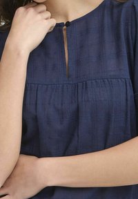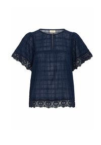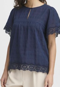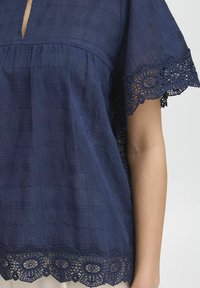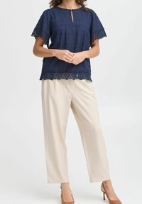 Femme portant un blouse bleu marine avec un contour en dentelle aux manches et à l'ourlet, avec une petite fente à l'avant et un bouton, associée à un pantalon beige.