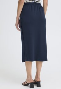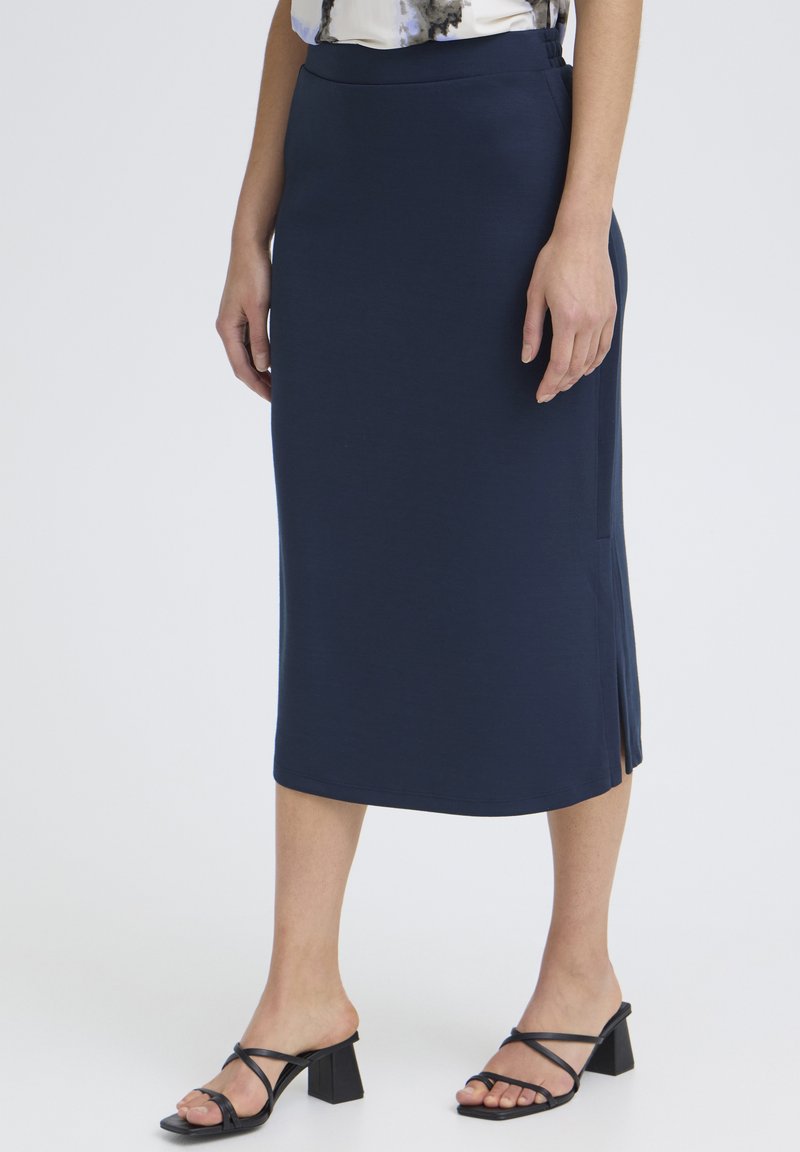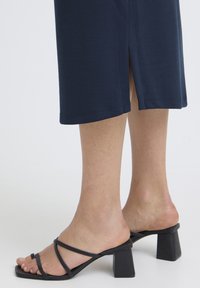 Femme portant une jupe crayon midi bleu marine associée à des sandales à talons noires, debout devant un fond clair uni.