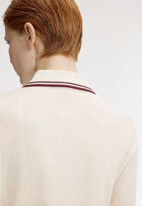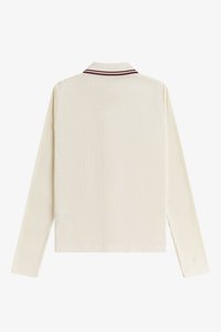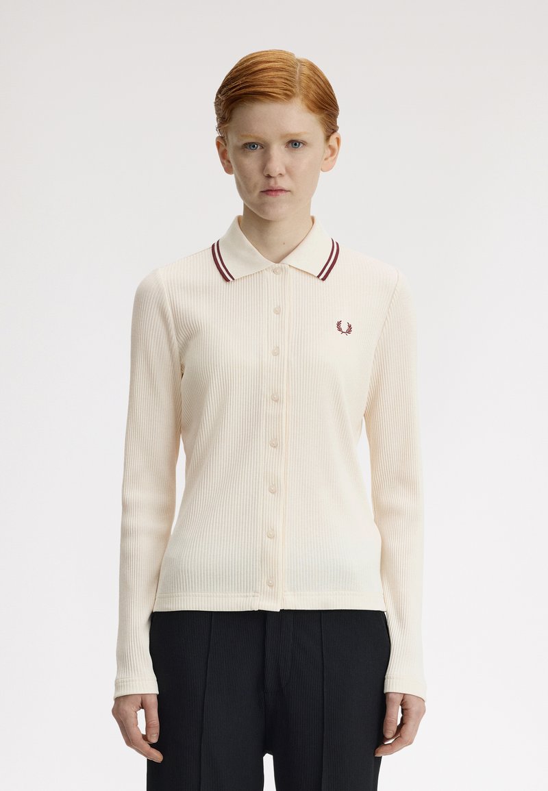 Jeune femme aux cheveux roux courts portant une chemise crème côtelée à manches longues avec col rayé bordeaux et pantalon noir.