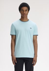 Jeune homme debout, portant un t-shirt à manches courtes bleu clair avec des bords rayés bleu foncé et un pantalon sombre, sur un fond uni.