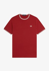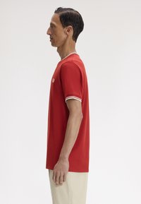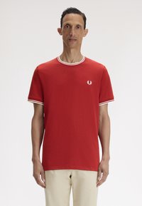 Homme debout, portant un t-shirt rouge à manches courtes avec un bord blanc au col et aux manches, pantalon beige, fond neutre.