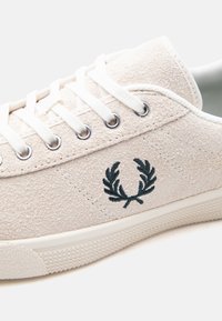 Baskets basses en daim beige avec semelle blanche, lacets à l'avant, logo couronne de laurier sur le côté et languette de talon foncée.